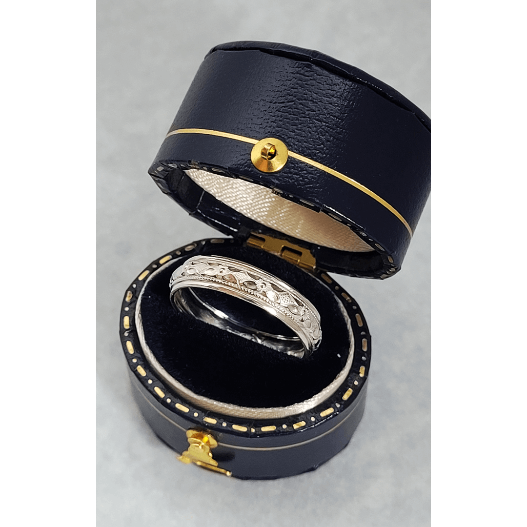 A more traditional, highly-polished, version of my Edwardian Style Women’s Wedding Band that beckons the timeless style of a bygone era when fine metalwork was designed with intricate details that were fashioned to look like fine lace.  This band has the same detail as the original women's wedding band, but is finished without the oxidation that highlights the ring band's texture and detail.